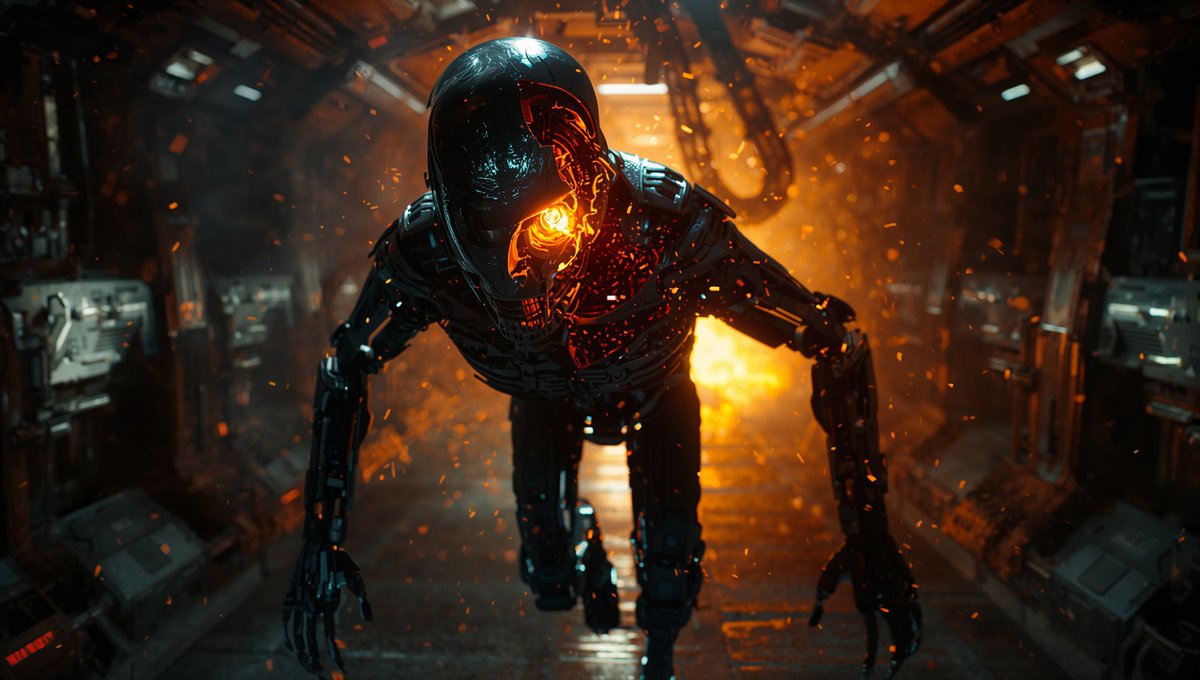 Image prompt: (sci-fi survival moment), a heavily damaged android drags itself across the floor of a burning spacecraft hallway, half its face peeled revealing glowing mechanics beneath, fire reflecting in one eye, alarms blaring, ceiling collapsing behind, one arm sparking, still reaching forward, not for survival — but for mission, inspired by Terminator and Alien Isolation