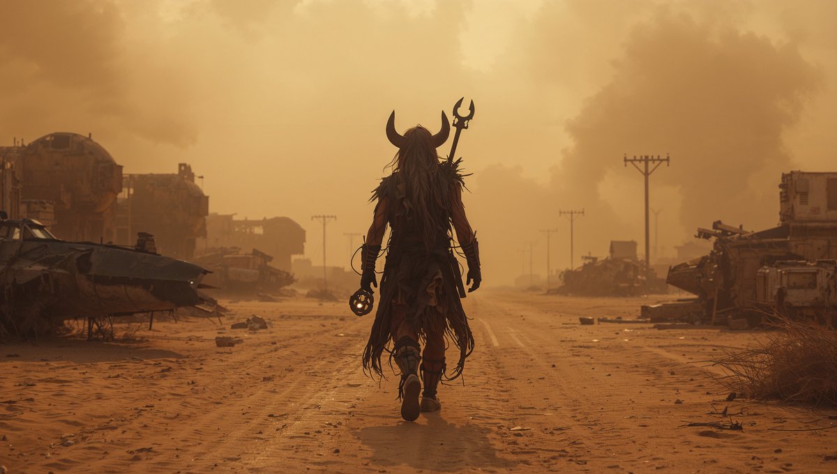 Image prompt: (post-apocalyptic cinematic frame), (warrior in animal hides and scrap armor walking through a desert full of crashed spaceships, holding a glowing relic), dust storm approaching, dead silence, {lost technology and ritual}, inspired by Horizon and Mad Max, 16:9 tracking shot, sandy desaturated tones, hyper-detailed character silhouette, 8k realism