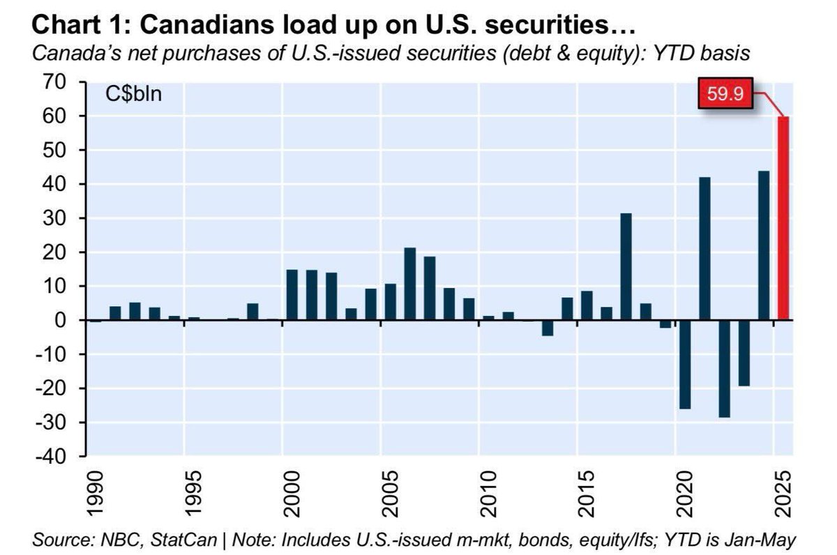 In the first 5 months of 2025, Canadians poured an unprecedented C$59.9B into U.S.-issued securities — the biggest spike in 35 years. 📈