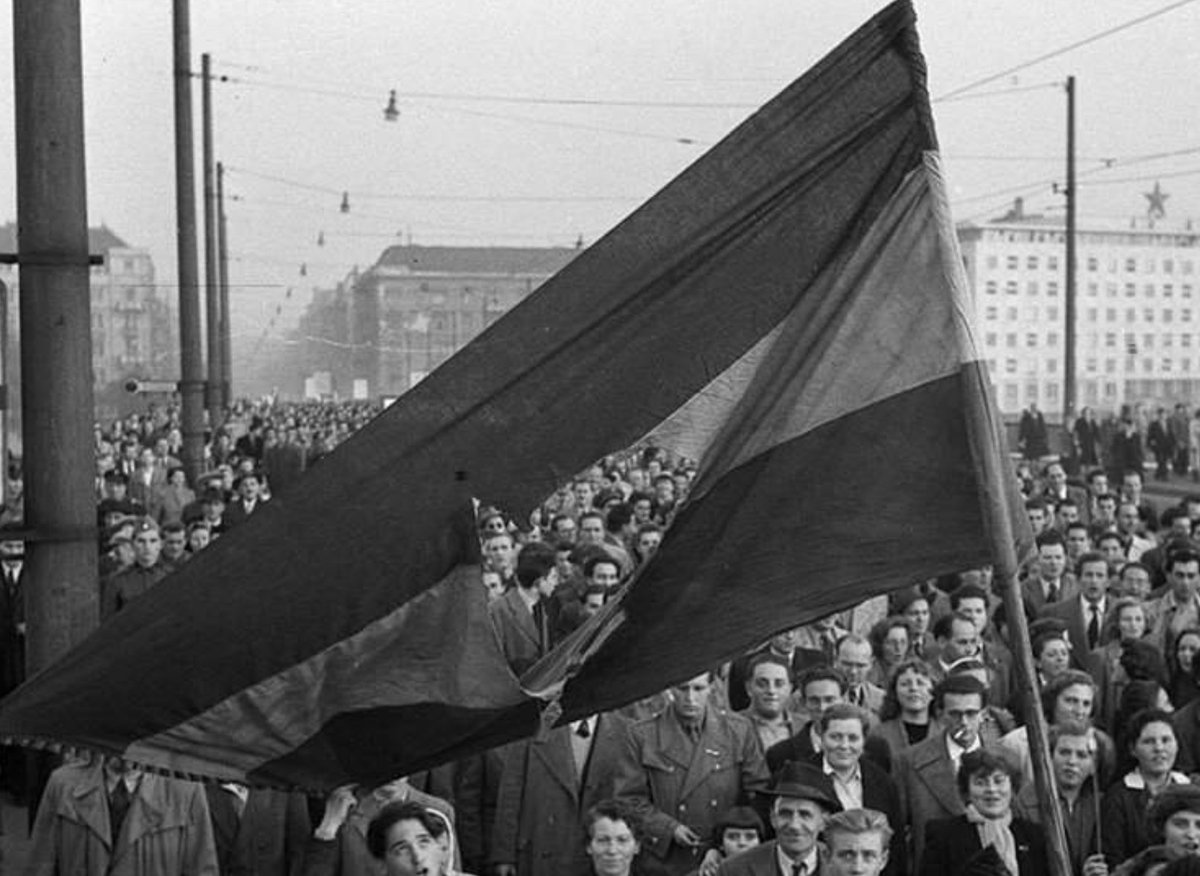 11/ Nagy appeals for a ceasefire but is ignored by both hardline Communists and the revolutionaries. Large crowds gather in the streets, waving Hungarian flags with the Communist insignia ripped out.