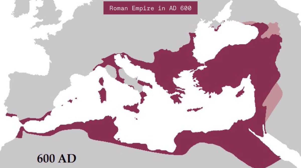 These maps show the approximate position of the Roman Empire in AD 600 and the result of the Islamic Conquest. (The empire also suffered some territorial losses to other peoples like the Goths and Slavs).Image