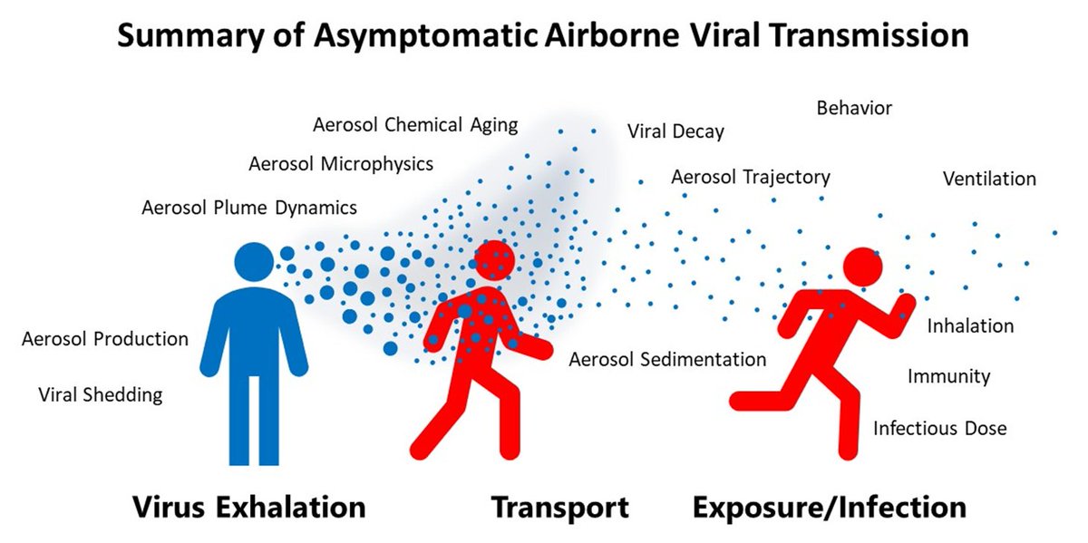 Airborne disease transmission is extraordinarily complicated, with many steps involved. Consequently, there are many different solutions that have been proposed to limit transmission. They largely involve the removal of exhaled aerosol from the air prior to inhalation. Image