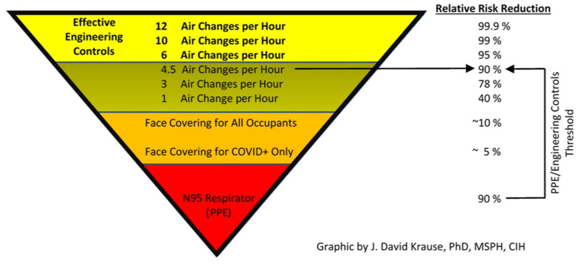 Ventilation is quantified by the air changes per hour, or the ACH. The more times the air in a room is exchanged with outdoor air, the lower the risk of transmission. The infectious aerosol is being removed from the room and unable to accumulate. Image