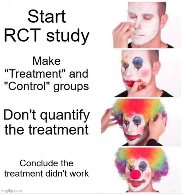 Bigger Picture: RCT studies are about quantifying both cause and effect. If you do not accurately measure the cause, then you will never know the cause and effectrelationship. Image