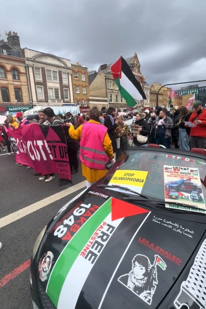 Just the right vehicle for an "anti-racist" protest. Leila Khaled was a PFLP terrorist hijacker. She's still around. She strongly backed the Hamas atrocities of 7 October 2023.