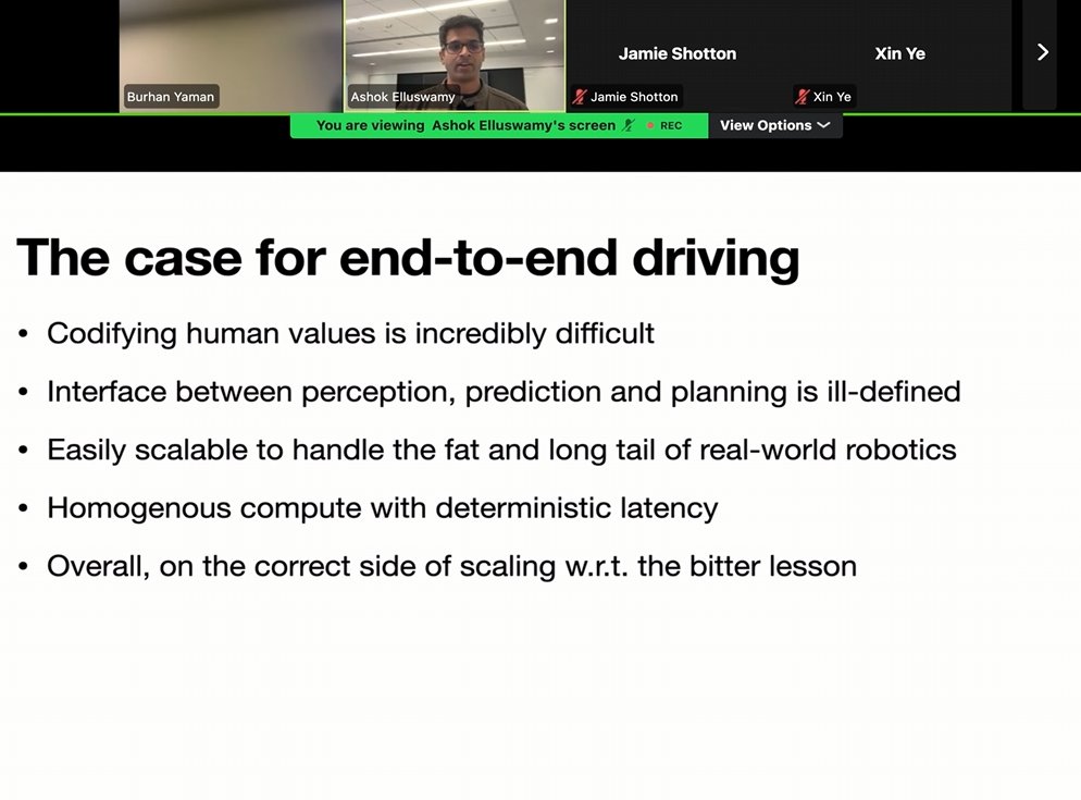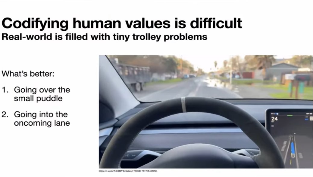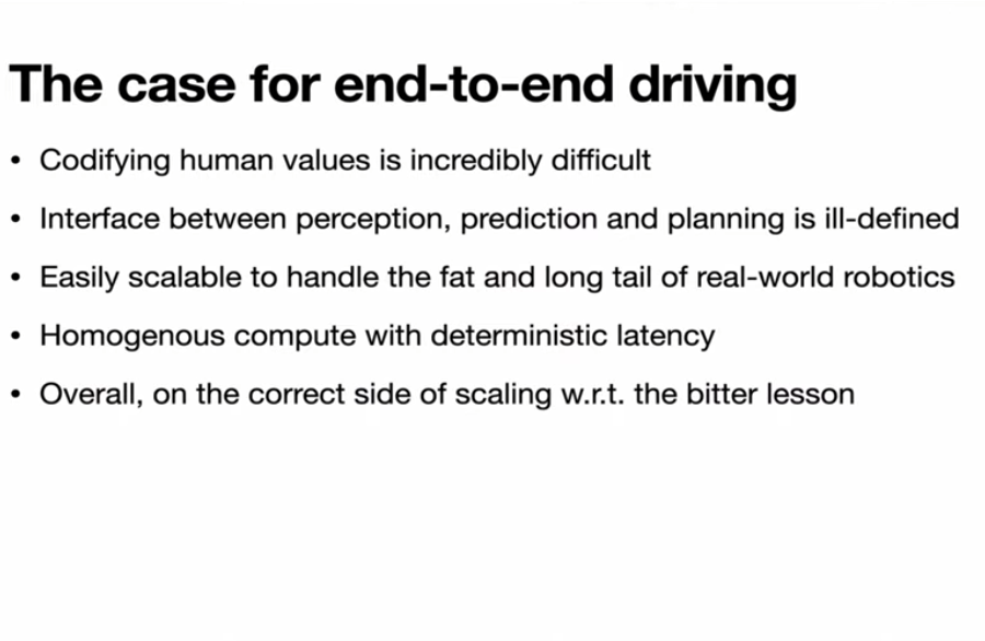 Why end-to-end? Because codifying human values in code is nearly impossible. When should you brake? How hard? It depends on speed, comfort, situation—no "one objective value." You can't write these alignment preferences in explicit rules. Image