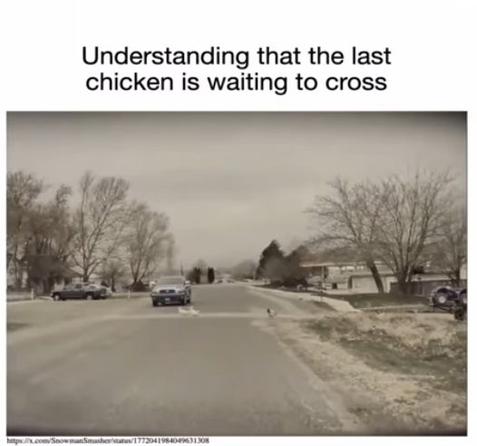 Watch this: chickens crossing the road. The car waits patiently for the last one to cross. No collision risk, but it understands their INTENT to cross—it's just the right thing to do. This is intelligence beyond obstacle detection. Image