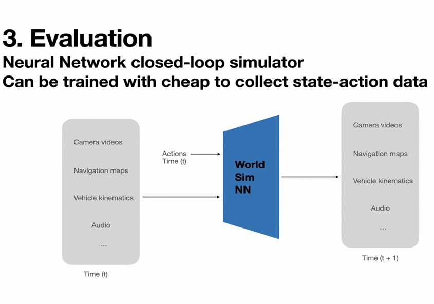 The world model enables closed-loop reinforcement learning: "let the car drive and verify that it doesn't collide with anything for a very long time." Train and improve the policy in simulation, deploy to reality. No real-world risk during training. Image