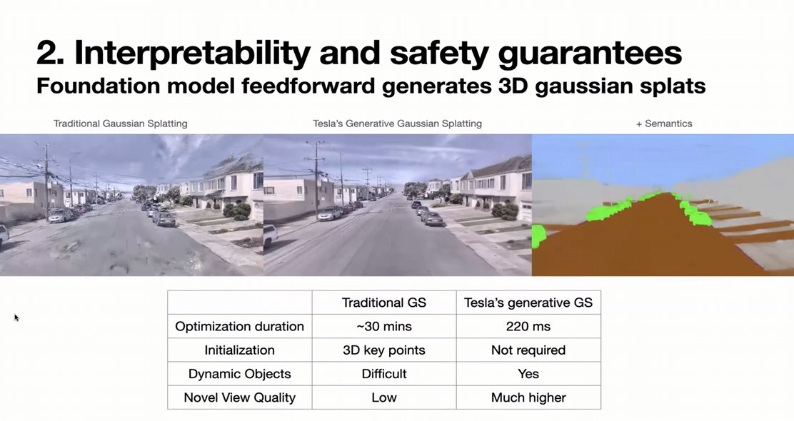 Traditional Gaussian splatting breaks down on novel views and takes tens of minutes. Tesla's variant is "ridiculously fast," works better with limited camera views, and maintains structure. No COLMAP needed. It's used to debug "is it safely avoiding obstacles?" Image
