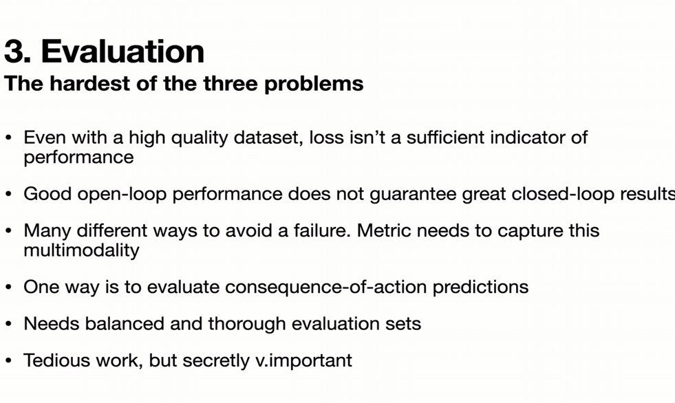 Open-loop performance can look amazing but not translate to real driving. Random fleet samples = boring highway driving. You need balanced eval sets. "Extremely important but very tedious work." Image