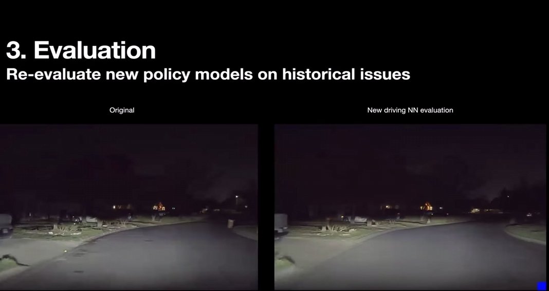 Take a year-old failure, replay it with your latest network, see if it's fixed. Example: was too close to a pedestrian → new model offsets way earlier. You don't need new real-world miles to verify improvements on known issues. Image
