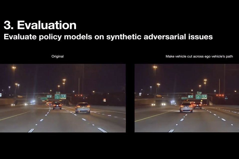 Or inject adversarial events: condition one vehicle to cut across your path while keeping the rest of the scene consistent. Systematically test corner cases without real-world danger. Synthetic safety testing at scale. Image