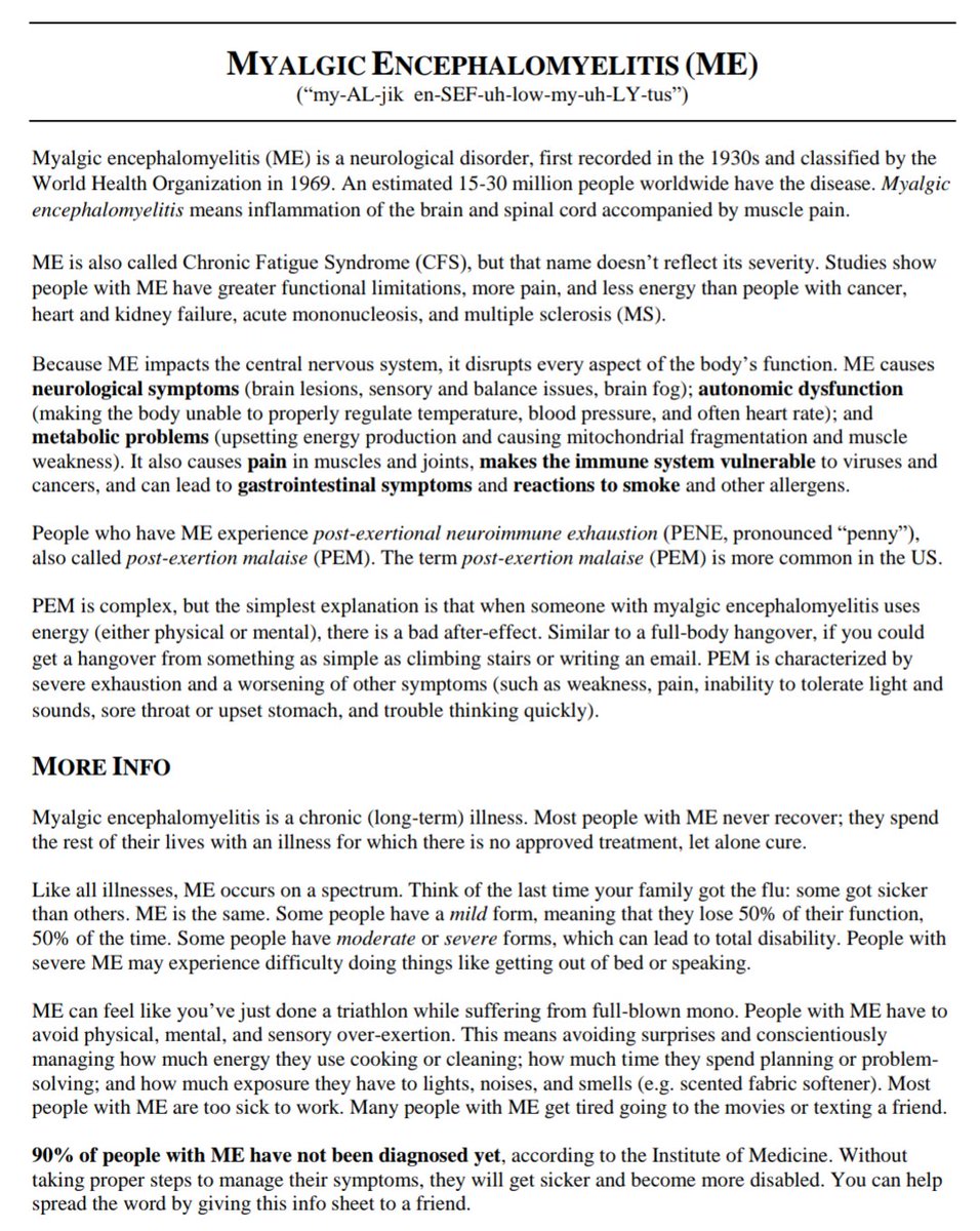 Make your outreach materials short and appealing and direct. Avoid referencing historical psychologising of ME or other stigmas. Focus on the 'takeaway' message(s): ME is a devastating illness and you're empowering your readers to do something positive about it.