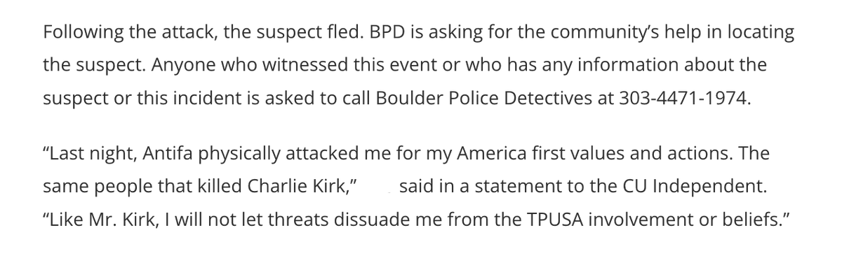 “Last night, Antifa physically attacked me for my America first values and actions. The same people that killed Charlie Kirk,” .. “Like Mr. Kirk, I will not let threats dissuade me from the TPUSA involvement or beliefs.”