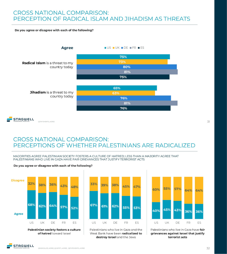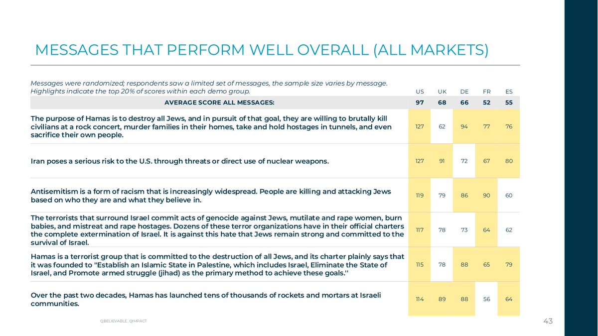 Across markets, statements that invoked “radical Islam,” “nuclear threats,” and graphic violence by Hamas performed best.