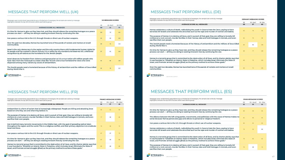 When Stagwell tested which narratives most effectively boosted sympathy for Israel across all five countries, the top-performing messages shared a pattern: fear and dehumanization.