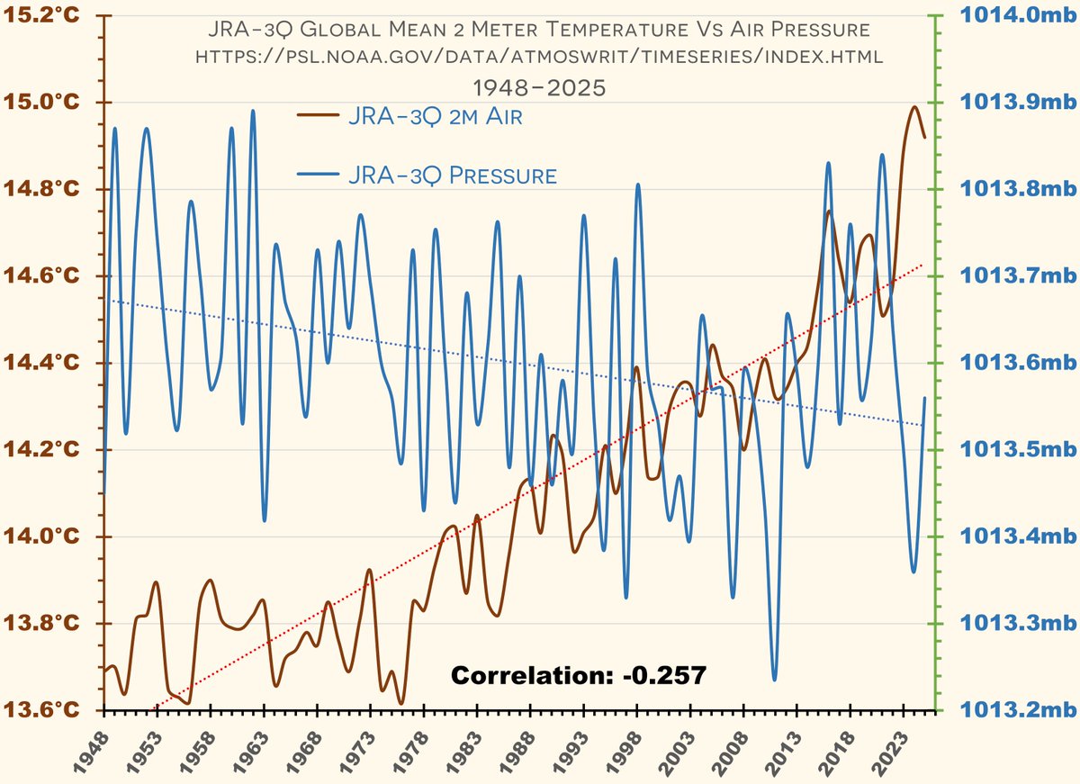 Two charts, sourced from the JRA-3Q (3 1/4s of a century) database: 1) 2 meters above the surface mean global temperatures, vs 2 meters above the surface average global air pressure.