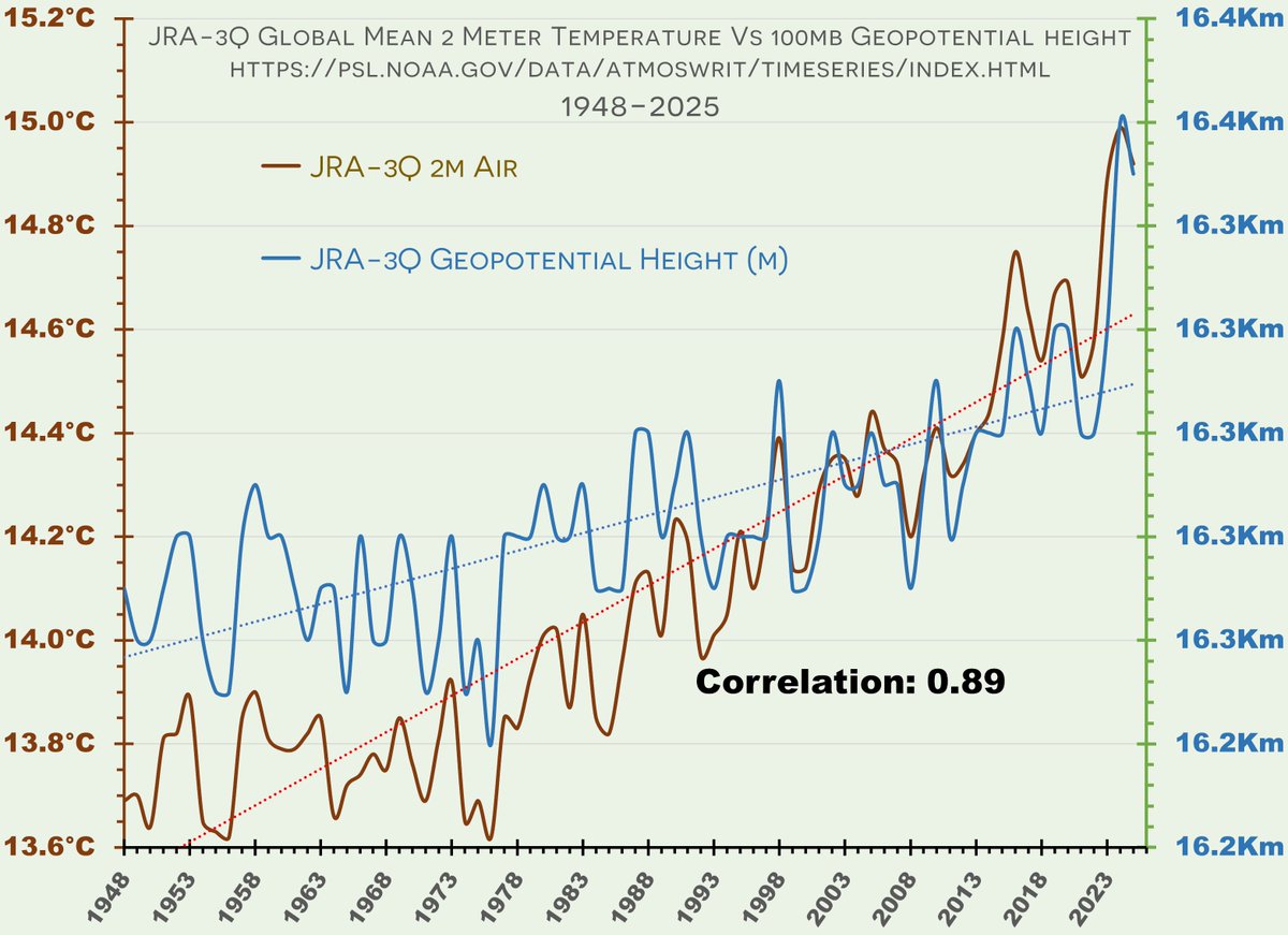 2) The second chart shows 2 meter temps vs the average global height in the atmosphere where air pressures are 100mb (roughly 10% of what it is on the surface) the two lines are almost in perfect synchronization, as the surface warms the atmosphere expands upwards.