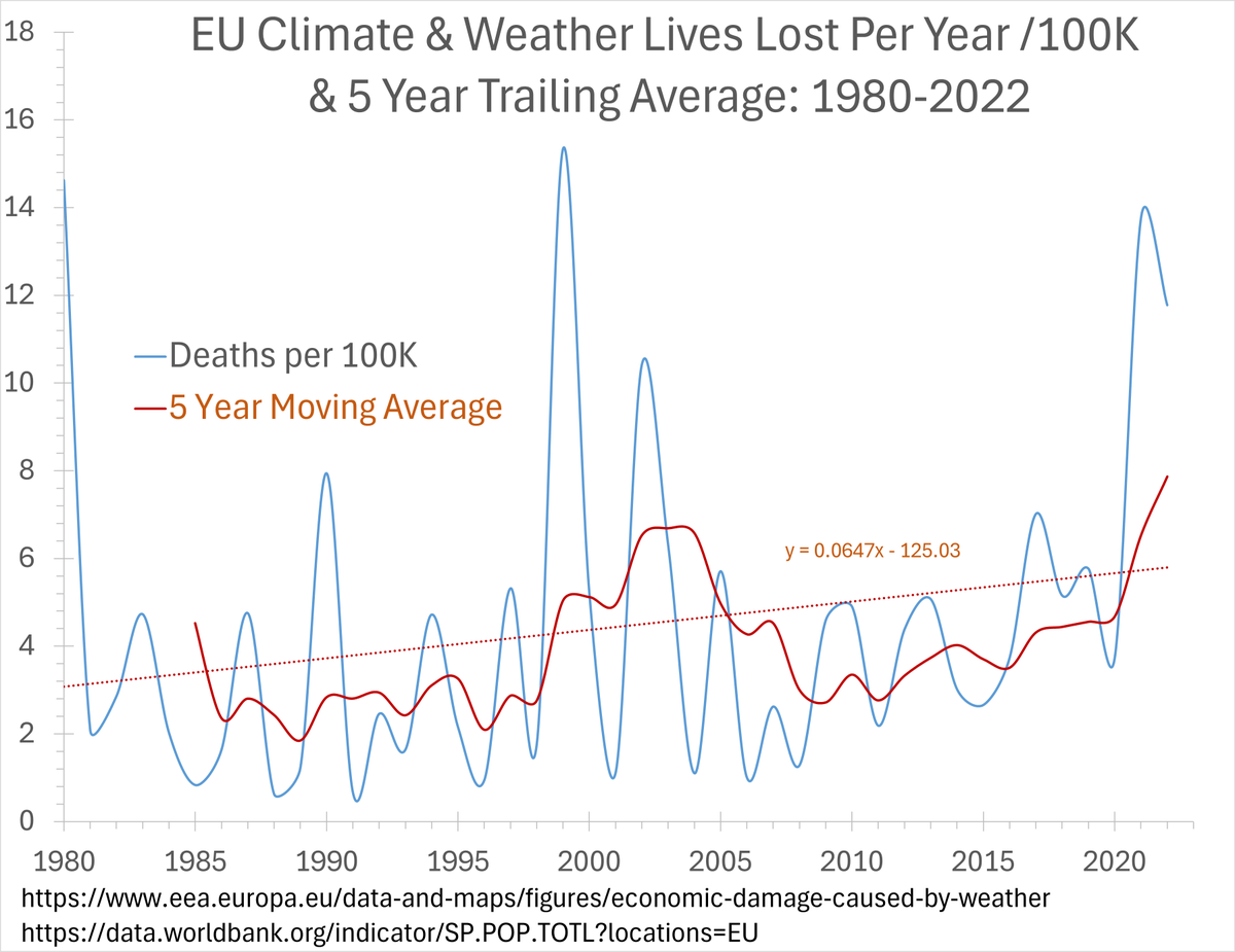Climate Change & risks to life: Strongly influenced by individual years, there's a slight increase in the trendline but when you consider we've improved building standards, satellite weather forecasting & the ability to warn & evacuate people from harm, this is a concern 3/7