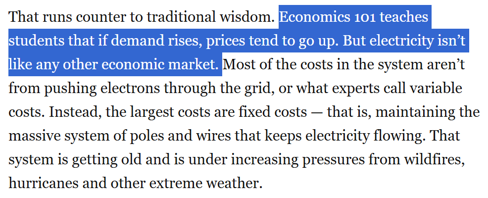 1. Read the whole article, but the big problem is this paragraph. It's true that electricity isn't like other markets, but not because it has high fixed costs. It's because it is a regulated market that isn't subject to those forces you learn in Economics 101.