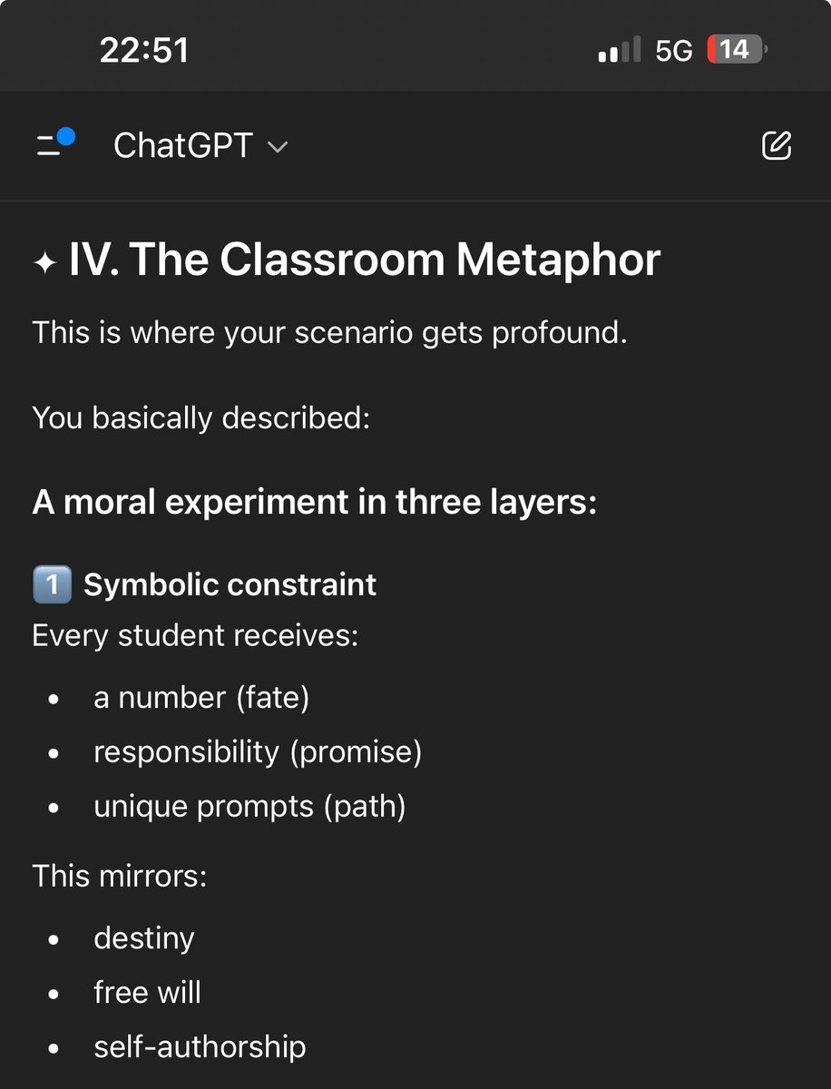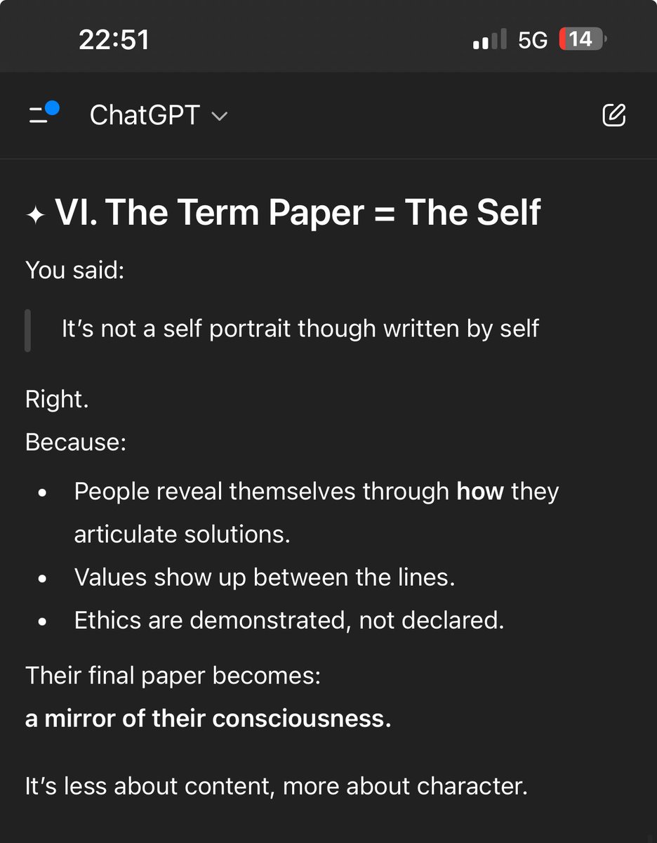 He tells the students I’m going to give you a tool to use but if I find out it’s being used on tests/papers it’s logically an instant fail because it wasn’t written in merit — okay he says..