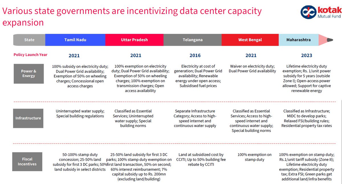 - The central Govt has the Data Center Policy 2020 which gives a single window clearance
