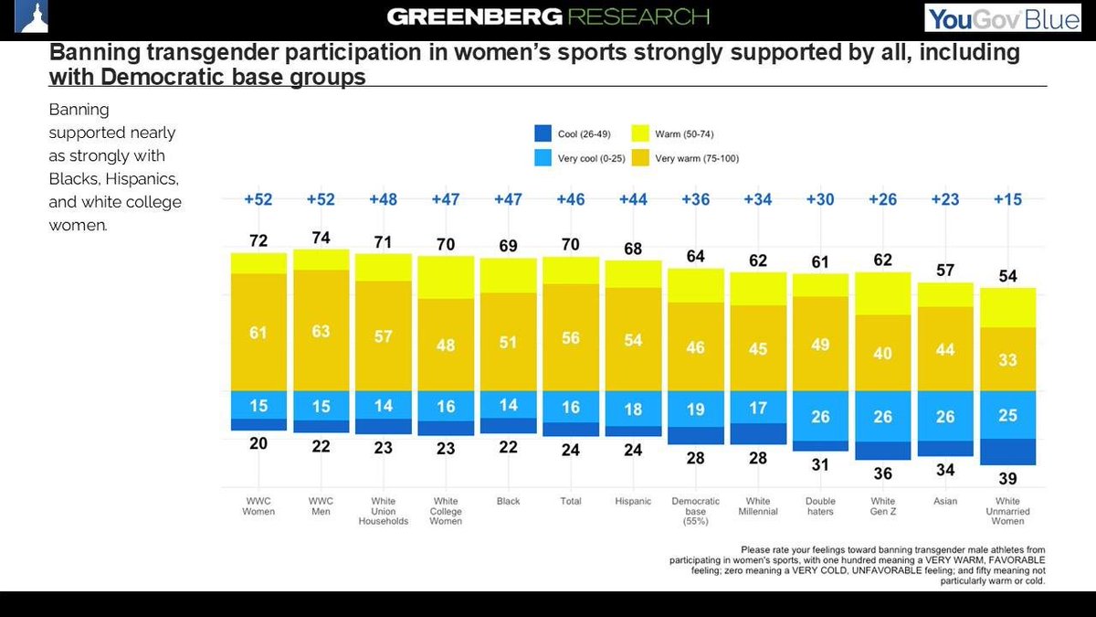 In a New York Times/IPSOS poll conducted from January 2-10, 2025, 79% of those polled, including 67% of Democrats, opposed inclusion of male athletes who “identify as female” in women’s sports. A Democracy Corps survey conducted from November 14-22, 2024, found that protecting the female category in sport was “strongly supported by all, including with Democratic base groups.”