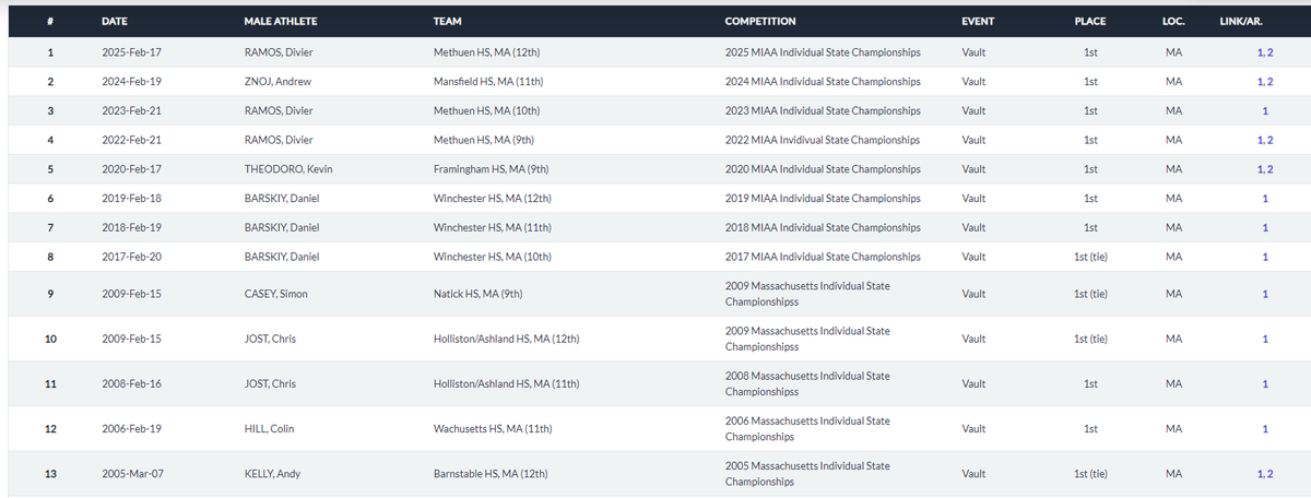 2/ This does not mean that boys did not take part in the meet. It appears that Noah Williamson of Melrose, the Middlesex League champion in the "girls" vault, tied for 4th place.
