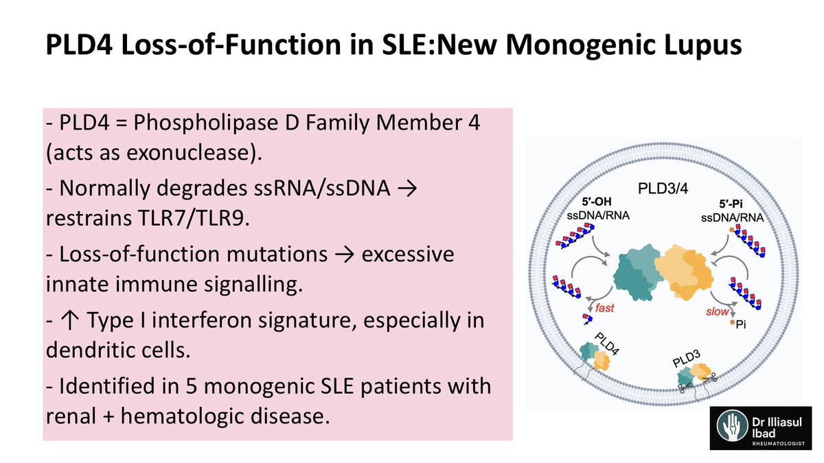 Loss-of-function → nucleic acid accumulation → failure to terminate TLR7/TLR9 activation.