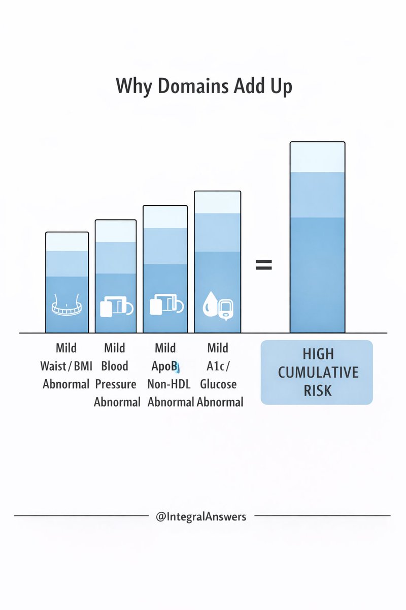 2/ Why it matters: cardiometabolic risk is additive. Mild “borderline” shifts across several domains (BP + ApoB/non-HDL + A1c + waist + ACR) can equal high risk—even when no single value looks dramatic.