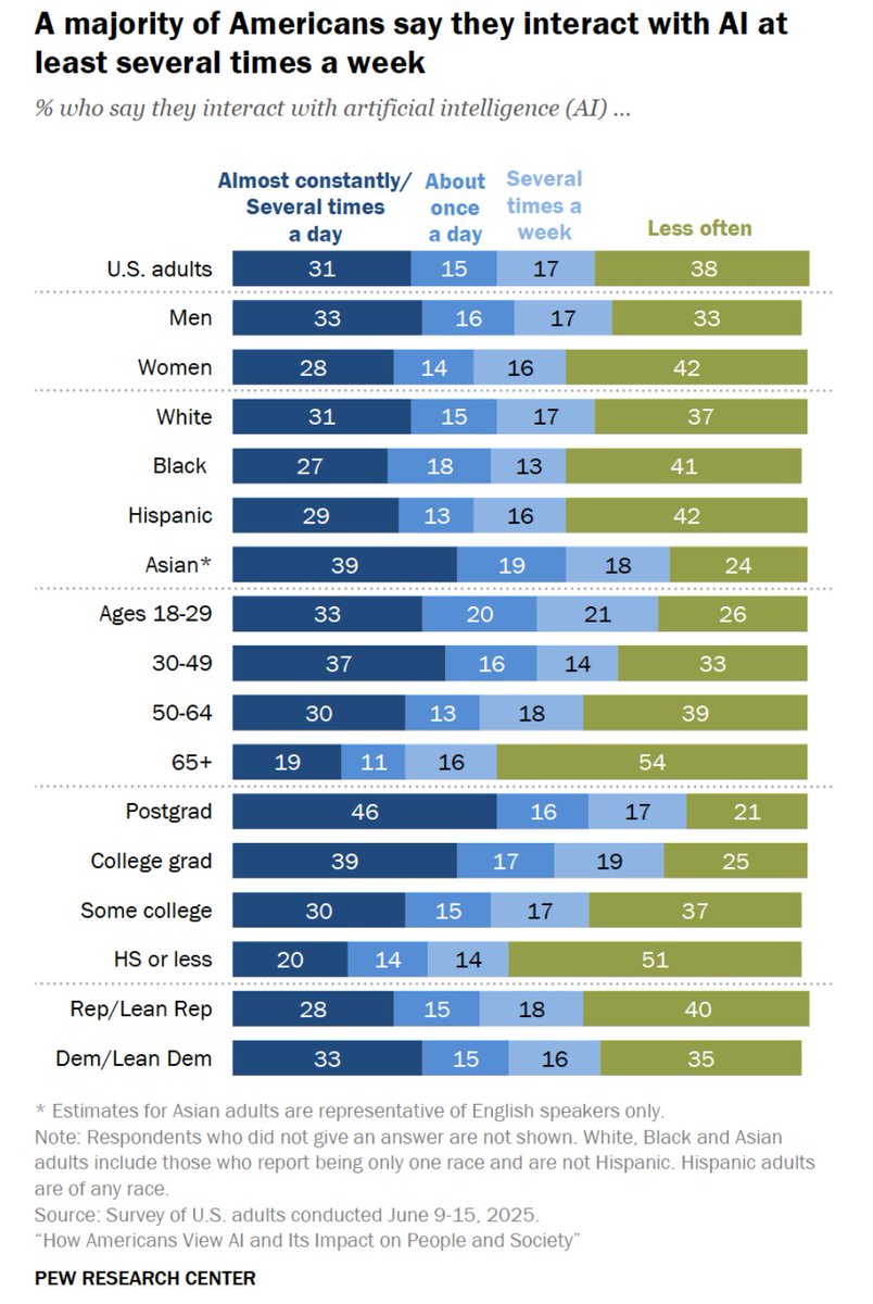 New AI numbers from Pew, fresh this morning. 62% of U.S. adults now say they interact with AI at least several times a week, and 31% are now using AI 'almost constantly' or several times a day.