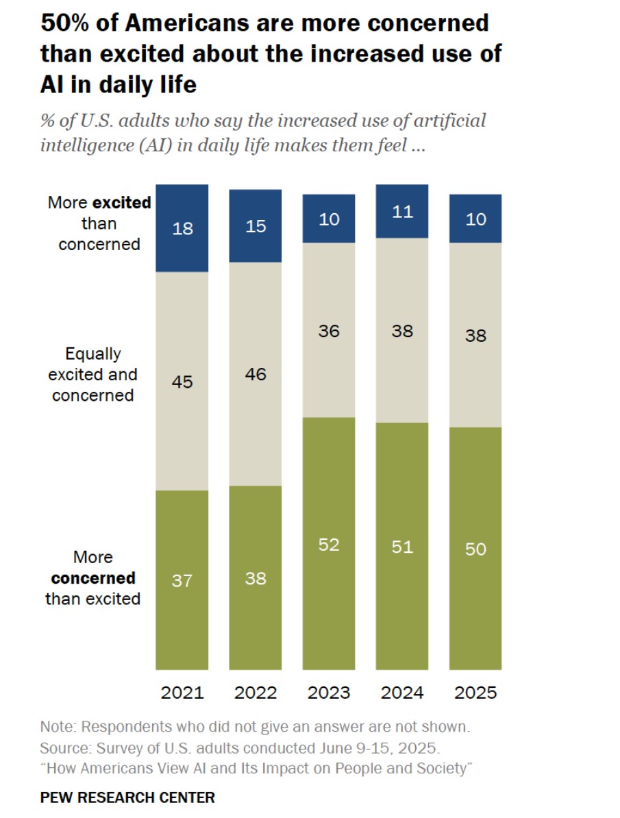Half of Americans are more concerned than excited about the increased use of AI in daily life. This is up from 37% in 2021.