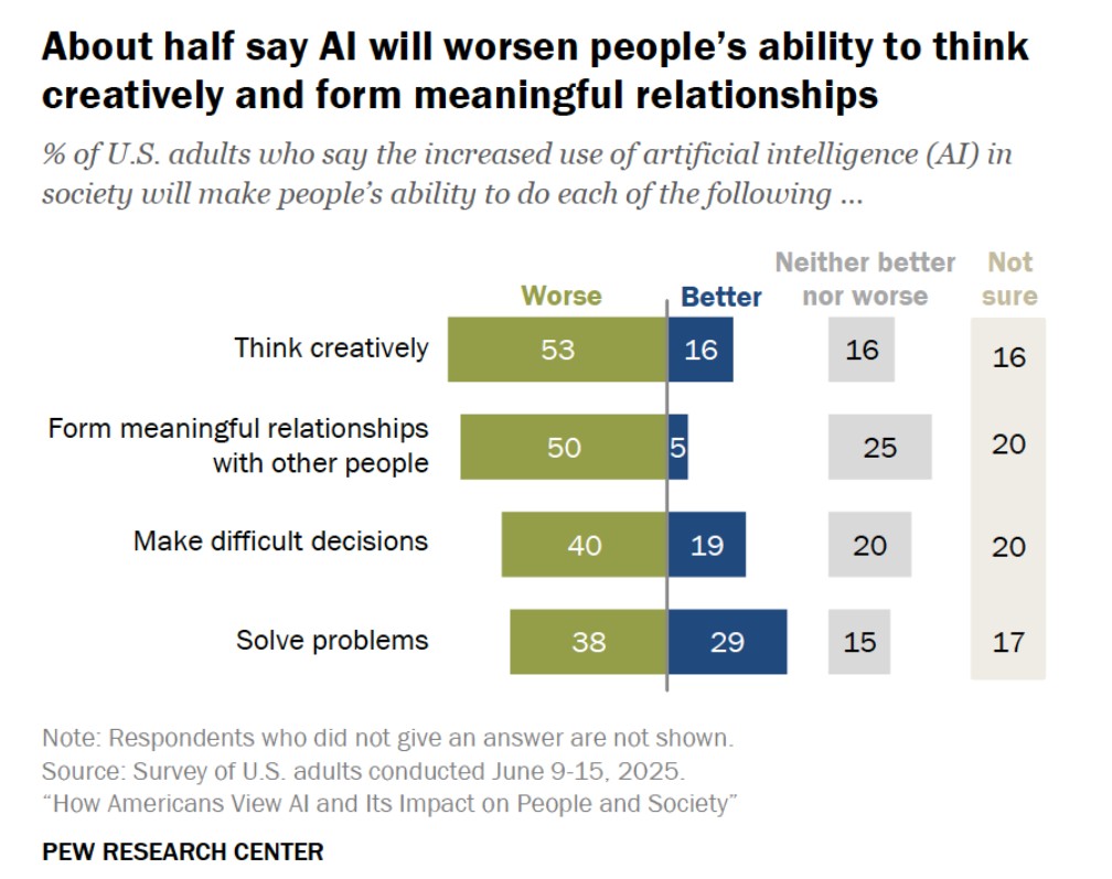 About half say that AI will worsen people's ability to think creatively and form meaningful relationships.