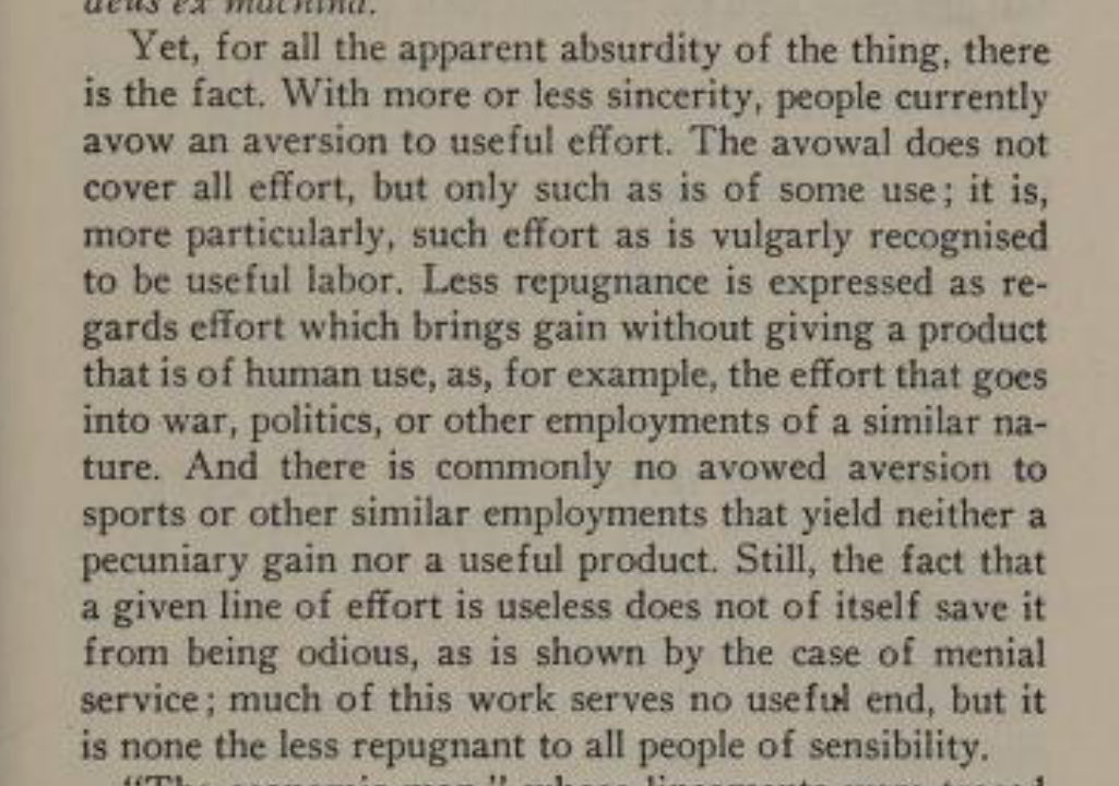 America’s fetishization of menial service work, which Veblen describes as “useless,” is a consequence of its ideological aversion to PRODUCTIVE LABOR— this is the “leisure empire” where professional athletes are considered “proletarian” because they have a boss