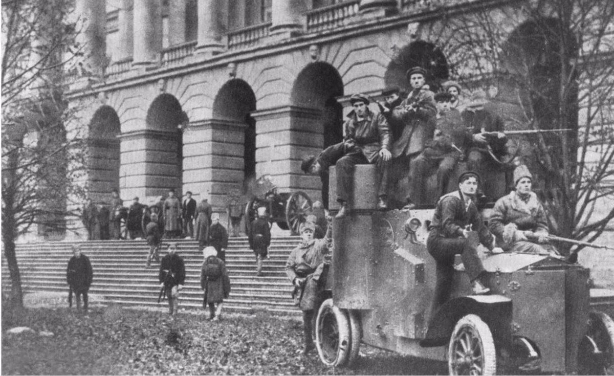 Esa misma madrugada llegan a Petrogrado los temibles fusileros letones, otrora fuerza de choque del zar. Hoy llevan bandas rojas en el brazo izquierdo, y saludan a los obreros con cazadora negra que montan guardia junto a las hombreras improvisadas.