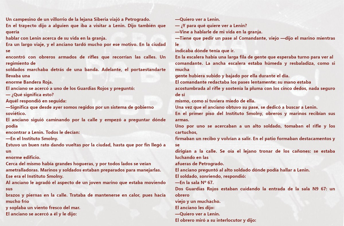 Un viejo siberiano llega a la capital el día 8, por la tarde. Es ajeno al vendaval de historia que ha sacudido su país. Pero allí, en la lejana Siberia, un exiliado le habló de un tal «Lenin».