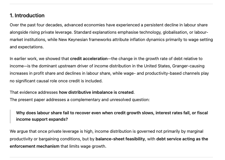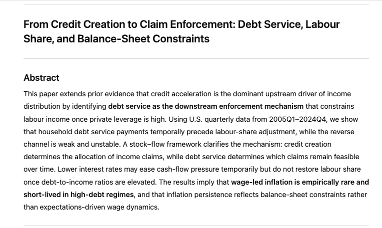 "Macroeconomic models that omit leverage and debt service as state variables are therefore empirically incomplete for the purposes of analysing modern inflation and distribution dynamics in high-debt economies."