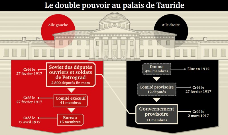 L’écroulement du régime impérial fait place à une dualité du pouvoir. Les soviets s’arment et se propagent dans chaque usine, quartier et village.✊Les notables libéraux cherchent à stabiliser la situation, promettent une constitution et garantissent les libertés fondamentales.📜