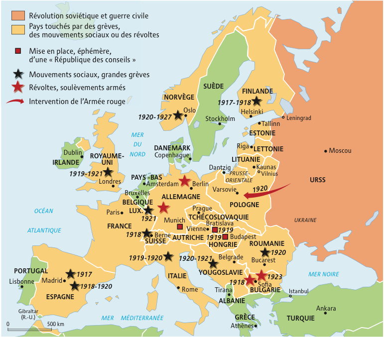 La guerre civile est très dure. La famine est terrible. Des révolutions communistes éclatent en Europe centrale mais toutes sont réprimées violemment.🚩Des actions insurrectionnelles ont aussi lieu à l’ouest et y permettent l’obtention de nombreux acquis sociaux et démocratiques.