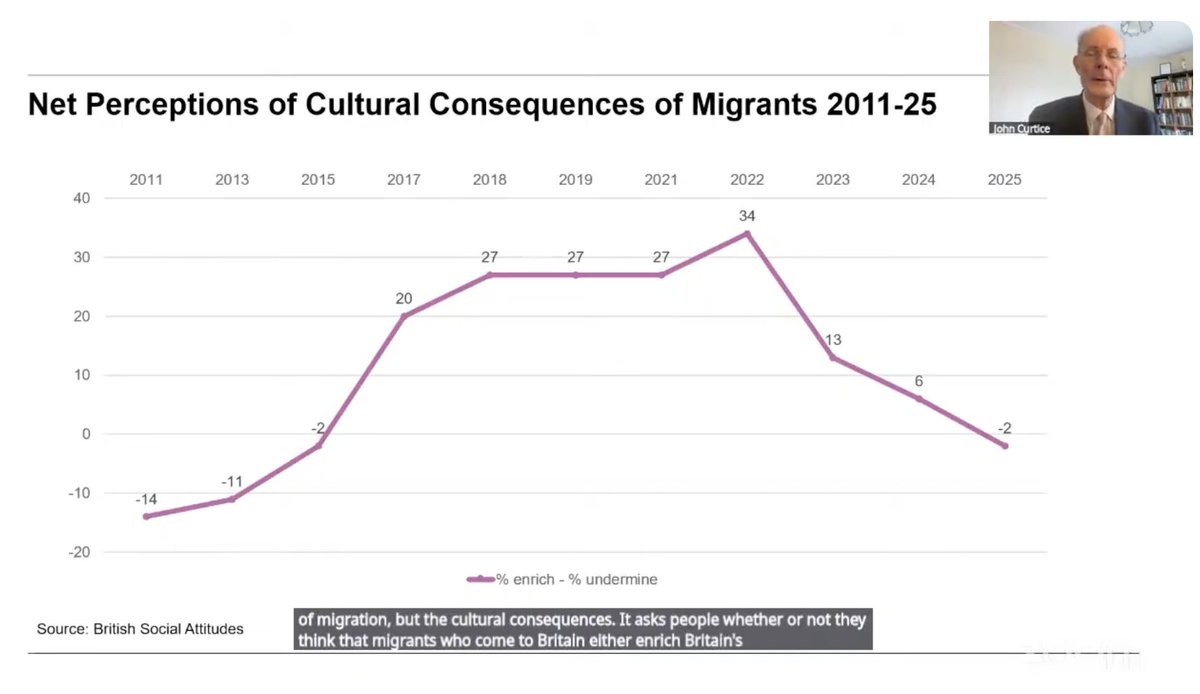 As @Sirjohncurtice says (this is screenshot from Zoom), those on right are even more -ve about migration than previously - but those on left still think it's broadly a good thing.