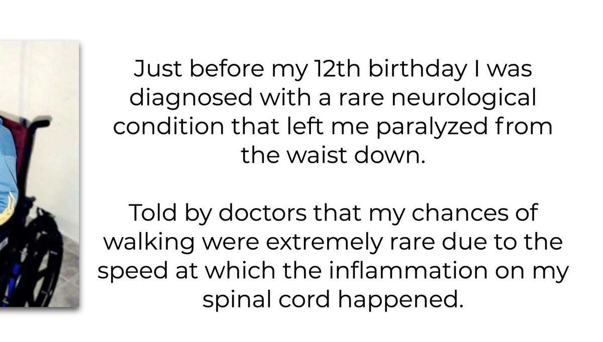 Just before my 12th birthday I was diagnosed with a rare neurological condition that left me paralyzed from the waist down. Told by doctors that my chances of walking were extremely rare due to the speed at which the inflammation on my spinal cord happened.