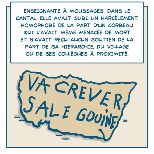 Le corbeau qui l'a abreuvée d'insultes homophobes et de menaces de mort, les villageois et le maire qui ne l'ont pas soutenue, les collègues de son académie aux abonnés absents... Tout cela a contribué à creuser sa tombe. (3/9)