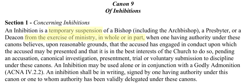 @vermeerlight @AcnaTruth @ACNAtoo Here's the canon regulating all inhibitions (including of the archbishop). A cleric can be inhibited at any time if the inhibiter "believes, on reasonable grounds," that the cleric has committed presentable behavior & that the inhibition is in the best interests of the church. 2/