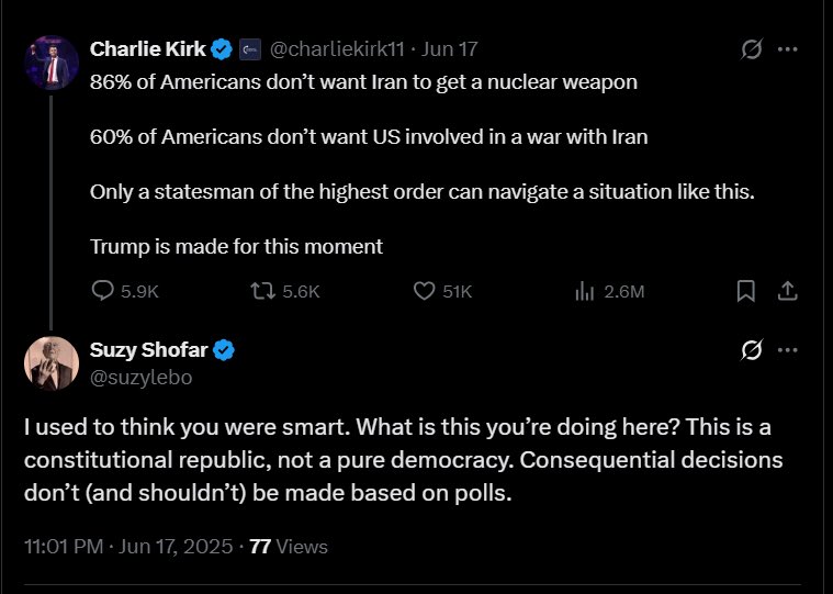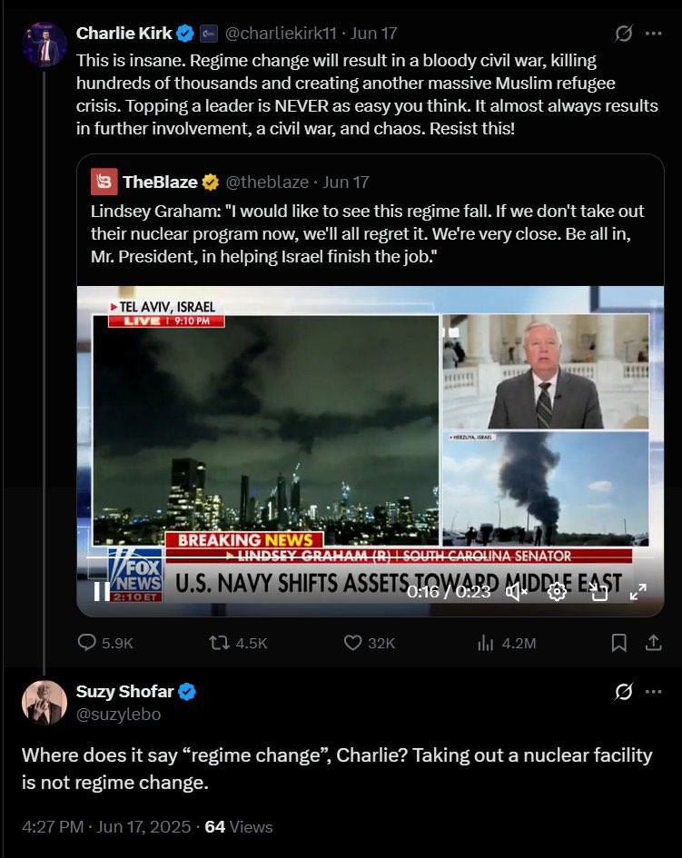During the 12 Day War, Suzy started her own forever war with Charlie Kirk, and more recently TPUSA. Now Kevin Roberts and The Heritage Foundation.