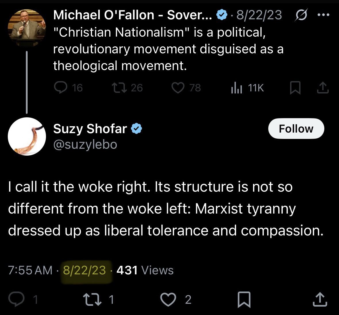 Here she is replying to Michael O’Fallon, a James Lindsay booster and owner of Lindsay’s “New Discourses” website, seeding the narrative of “The Woke Right” to O’Fallon.