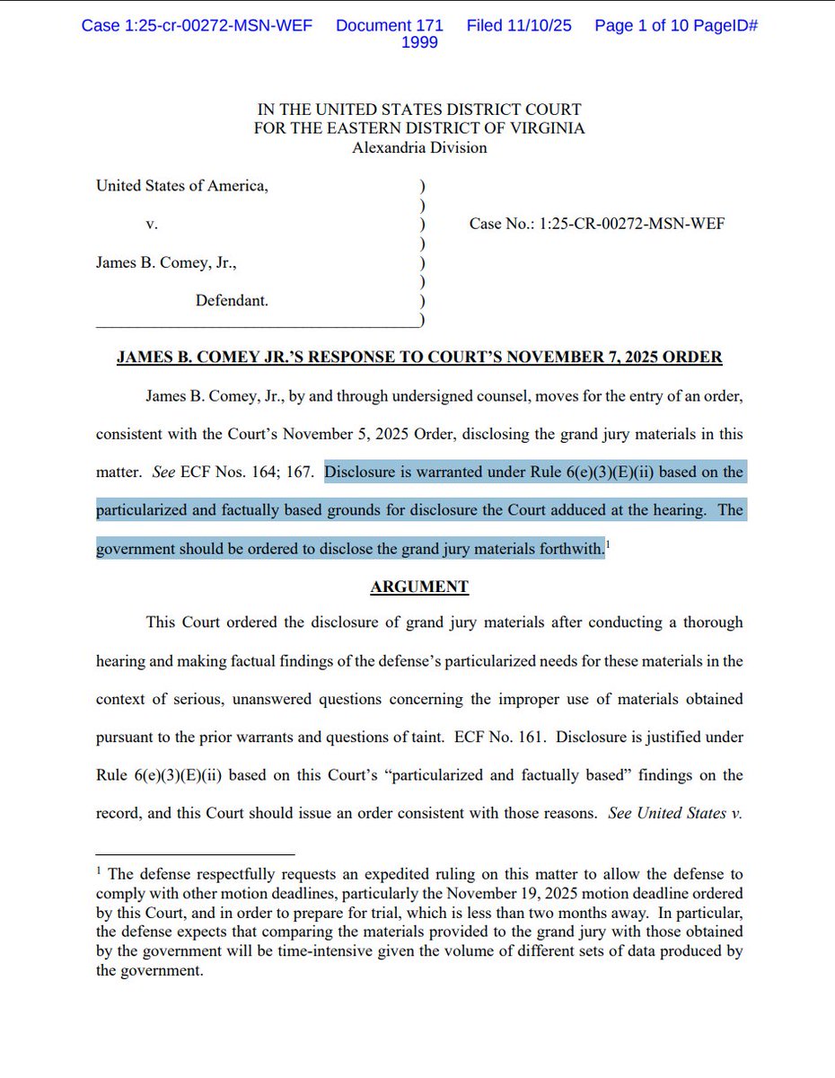 Comey wants the grand jury materials disclosed; Govt wants the judge to review them in camera. 1/n