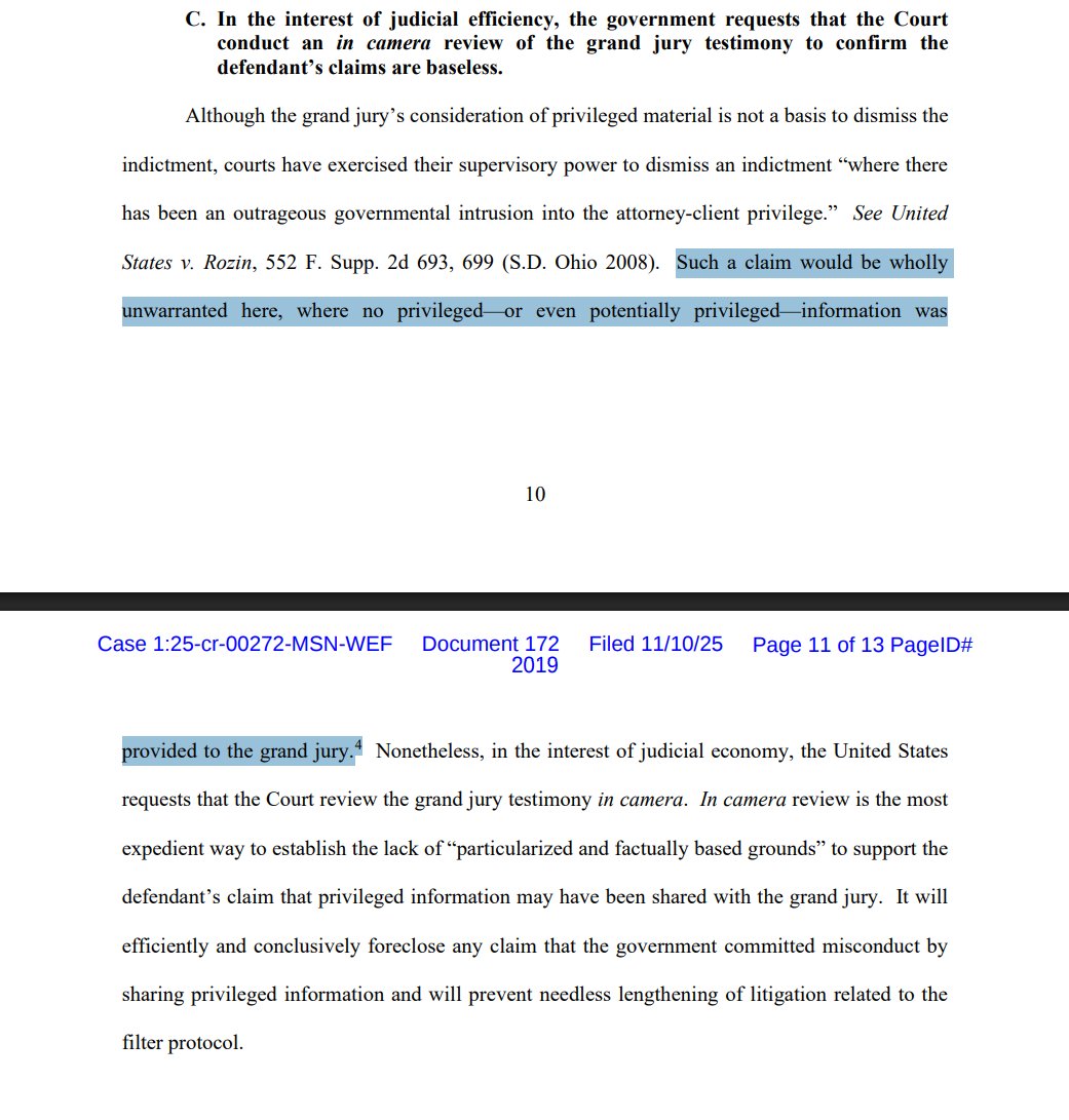 Interestingly, they address whether the grand jury was told of the attorney-client privileged information, which is material they are also seeking a filter team protocol for and is material that the only witness the grand jury heard from, the FBI agent, was exposed to and was later pulled off the case because of that exposure...