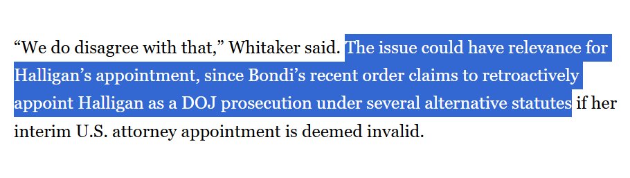 "The issue could have relevance for Halligan’s appointment, since Bondi’s recent order claims to retroactively appoint Halligan as a DOJ prosecution under several alternative statutes"