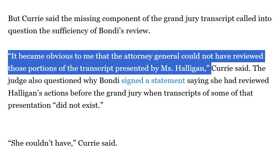 The grand jury transcripts "confirmed that “Ms. Halligan acted alone,” without any other government attorneys in the room. That could threaten both cases if Currie ultimately decides Halligan was invalidly appointed"