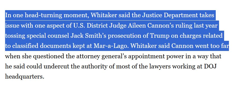 "In one head-turning moment, Whitaker said the Justice Department takes issue with one aspect of U.S. District Judge Aileen Cannon’s ruling last year tossing special counsel Jack Smith’s prosecution of Trump on charges related to classified documents kept at Mar-a-Lago. Whitaker said Cannon went too far..."
